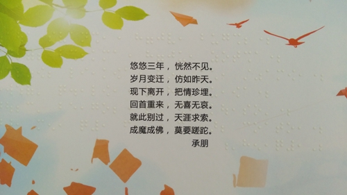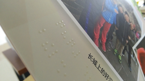 一個架子上,放著一疊厚實(shí)的精裝冊子,封面寫著“2018屆貳家紀(jì)念冊”。翻開冊子,與以往見到的一樣,紙面印著一張張燦爛而純真的笑臉和一些文字,不一樣的是,紙面上還多了一些微微凸起圓點(diǎn),大約厚度1mm左右,按一種特有的規(guī)律排列,看起來晶瑩剔透,用手撫摸一下,顆粒感很真實(shí),這就是“盲文畢業(yè)紀(jì)念冊”。
